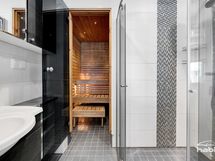 - Suihku, Pesukoneliitäntä, Mukavuuslattialämmitys, Tilaa pesukoneelle, Kaapisto, Allas, Lämminvesivaraaja, Peilikaappi, Suihkukaappi