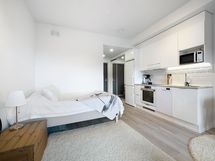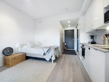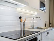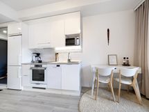 - Kaapistot, jääkaappi/pakastin, astianpesukone, induktioliesitaso, kiertoilmauuni, liesituuletin, mikroaaltouuni. Lattia: Vinyylilankku. Seinät: Maalattu, välitila laatoitettu