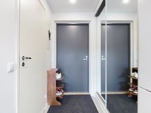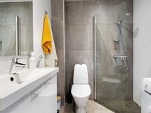- Kylpyhuone/wc, allaskaluste, peili, suihku, kääntyvä suihkuseinä, pesukoneliitäntä, lattialämmitys. Lattia: Lattia 10x10 laatta. Seinät: Tehosteseinä 60x60 laatta, muut seinät 30x60 laatta