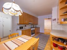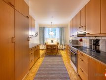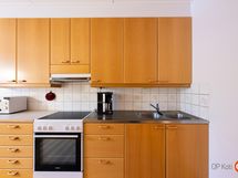 Jääkaappi, pakastekaappi, keraaminen liesi, liesituuletin, kaapistot, kiinteät valaisimet.