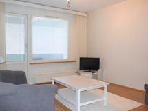 Valoisa olohuone, josta käynti parvekkeelle. Olohuoneen seinät tapettia, lattia laminaattia.