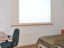 Tilava makuuhuone, jossa seinät tapettia, lattia laminaattia.