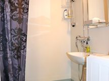 Pesutilojen kuvaus: Kylpyhuoneen seinät ja lattia muovimattoa. Varusteena suihku, pyykinpesukoneliitäntä, wc-toiminnot.
