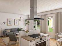 Korkeampi huonekorkeus ja suuret ikkunat tuovat lisää valoa ja tilan tuntua. Kaikkialla on jalalle miellyttävä lattialämmitys. Olohuoneen jatkeena on avara katettu puurakenteinen terassi.