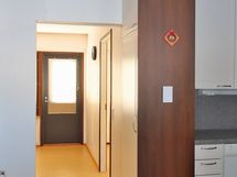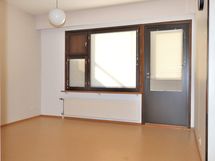 Olohuoneesta käynti takapihalle. Maalatut seinäpinnat, muovimattolattia.