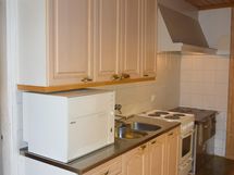 Jääkaappi, pakastekaappi, sähköliesi, liesikupu, astianpesukone pöytämalli, kaapistot, kiinteät valaisimet, puuliesi.