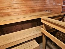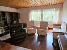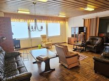 Iso olohuone ja tupa. Varaava takka. Parkettilattia, seinät leyvä, katot paneloitu.