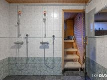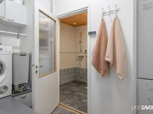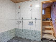 - Pesutilojen varusteet: Suihku ja pesukoneliitäntä. Pesutilojen kuvaus: Saunan yhteydessä kylpyhuone, jossa kaksi suihkua. Erillisen "yksiön" yhteydessä kph/wc. Erillisten WC:n lukumäärä: 2. Erillisen WC:n varusteet: WC-istuin, suihku, pesukoneliitäntä, peilikaappi, pesuallas, allaskaappi ja bidee-suihku.