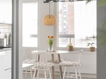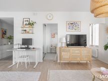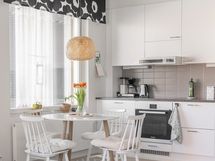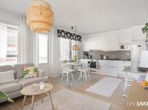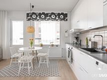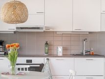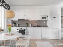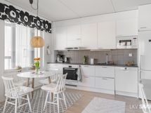 - Keittiön varusteet: Jääkaappipakastin, erillisuuni, liesi, liesituuletin, mikroaaltouuni (integroitu) ja astianpesukone. Liesi: Induktioliesi. Työtason materiaali: Laminaatti. Valkoinen I-mallinen avokeittiö, jossa valkoiset kaapistot, tummanharmaa työtaso, komposiittiallas ja kaarihana. Alakaapistot vetolaatikoilla.