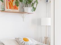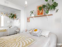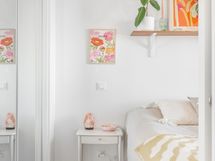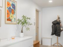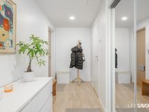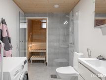 - Pesutilojen varusteet: WC-istuin, suihku, suihkuseinä (kääntyvä), pesukoneliitäntä, lattialämmitys, peilikaappi, allaskaappi (vetolaatikoin) ja bidee-suihku. Pesutilojen kuvaus: Laatoitettu kylpyhuone, jossa tehostelaatoitus takaseinällä sekä tila isommallekin pesukoneelle.