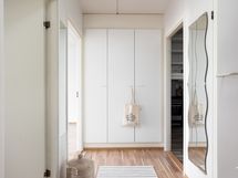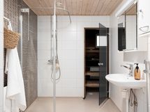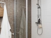 - Varustus: suihkuseinä, pesukoneliitäntä, wc-istuin, suihku, peilikaappi, kiinteät valaisimet.