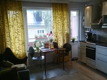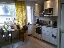 - Halogeenivalot, Lasikaapit, Suuri tiskipöytä, Paljon kaappitilaa, Laminaattitasot, Teräskalusteet, Keraaminen liesi, Liesituuletin, Jää-pakastinkaappi