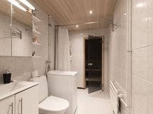 - Suihku, Pesukone, Pesukonevalmius, Peilikaappi, Allaskaappi, Laattaseinä, Halogeenivalot, Laattalattia