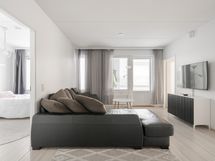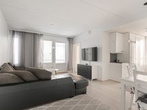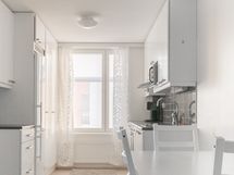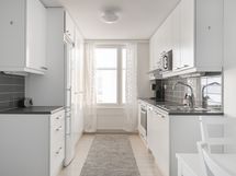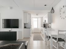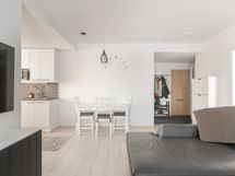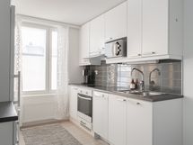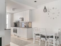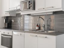 - Keittiön varusteet: Jääkaappipakastin, erillisuuni, liesituuletin ja astianpesukone. Liesi: Induktioliesi. Työtason materiaali: Laminaatti.