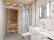 - Pesutilojen varusteet: WC-istuin, suihku, suihkuseinä, pesukoneliitäntä, lattialämmitys, peilikaappi, pesuallas, allaskaappi ja bidee-suihku.