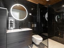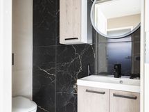 Pesuhuone, jossa 2 suihkua, kylpyhuone, suihku, erillinen wc, pesukoneliitäntä, lattialämmitys, kylpyhuonekaapisto, kiinteät valaisimet, sähkösauna. Erillinen rantasauna.