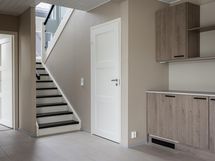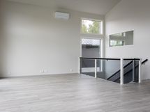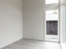 Sisääntulokerroksessa on kaksi makuuhuonetta, kodinhoito- ja kylpyhuone sekä keittiön ja olohuoneen muodostama oleskelutila. Tila on valoisa ja avaruuden tuntua lisää lähes viiden metrin huonekorkeus. Olohuoneen suurista ikkunoista aukeaa esteettömät maisemat Päijänteelle kohti ilta-aurinkoa.