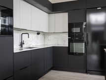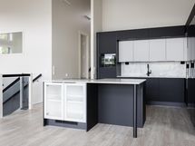 Jääkaappi, pakastin, erillisuuni ja induktioliesitaso, astianpesukone, liesituuletin (aktiivihiilisuodatin), kaapistot