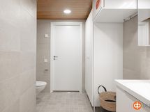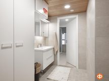 Suihku, suihkuseinä, peilikaappi, allaskaappi, pesukoneliitäntä, lattialämmitys.