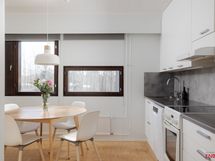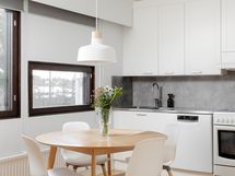 - Liesi: sähköliesi. Kylmäsäilytys: jääkaappi/pakastin. Varustus: liesituuletin, astianpesukone, kiinteät valaisimet. Avara keittiö, jossa hyvin tilaa ruokapöydälle. Näkymät takapihan puolelle.