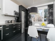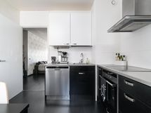 - Jääkaappi/pakastin, induktioliesi, erillisuuni, liesituuletin/ aktiivihiilisuodatin, mikroaaltouuni, kaapistot, astianpesukone