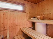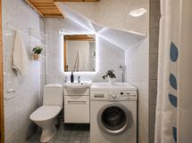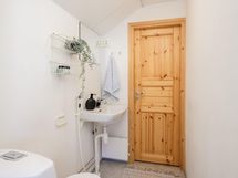 Käyntikerroksen kylpyhuoneessa varusteina: suihku, pesukoneliitäntä, pesuallas, allaskaappi, peili, bideesuihku, wc-istuin, sauna, sähkökiuas, kiinteät valaisimet ja lattialämmitys. Yläkerran wc:ssä varusteina: wc-istuin, bideesuihku, pesuallas, peili ja kiinteät valaisimet.