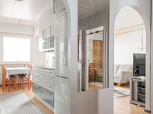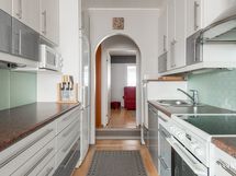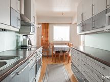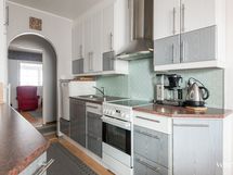 - Keittiön varusteet: Jääkaappipakastin, liesi, liesituuletin ja astianpesukone. Liesi: Induktioliesi. Työtason materiaali: Laminaatti.