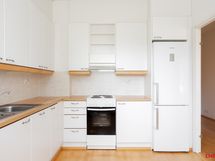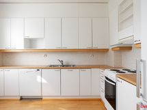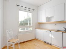 Liesi: sähköliesi. Työtasot: puu. Varustus: astianpesukone, liesituuletin / hormi. Mdf-kaapistot. Työtasot massiivi koivu. Lattia pyökkiparketti.