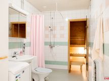 Pesutilojen kuvaus: Kylpyhuoneessa muovimatto lattialla, seinät laatoitettu. Varustus: pesukoneliitäntä, wc-istuin, suihku.