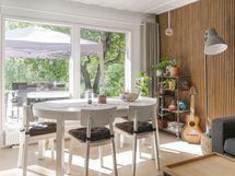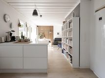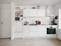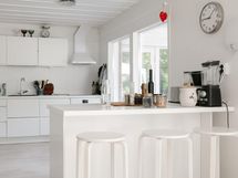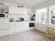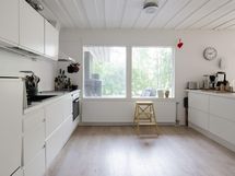 - Jääkaappi, pakastekaappi vanhempi arkkupakastin autotallissa, erillisuuni, induktioliesi, liesituuletin, astianpesukone, kaapistot, kiinteät valaisimet. Keittiö on tilava ja valoisa, toimiva.