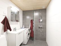 Pesutilojen varusteet: Peilikaappi, lattialämmitys, pesukoneliitäntä, suihkuseinä, wc-istuin ja suihku.