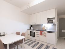 Keittiön varusteet: Astianpesukone ja jääkaappipakastin. Liesi: Keraaminen liesi. Työtason materiaali: Laminaatti.