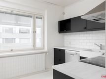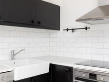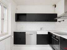 Liesi: induktio, erillisuuni. Työtasot: laminaatti. Kylmäsäilytys: jääkaappi/pakastin. Varustus: liesituuletin, astianpesukone.