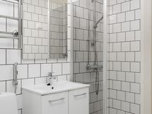 Pesutilojen kuvaus: kylpyhuone remontoitu 2019. Varustus: suihkuseinä, pesukoneliitäntä, lattialämmitys, wc-istuin, suihku, peili.