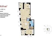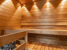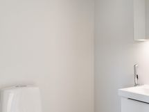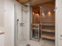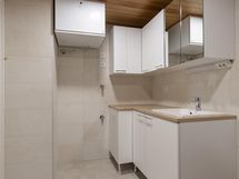 - Kylpyhuone/kodinhoitohuone, suihku, suihkuseinä, valaisinpeilikaappi, allaskaappi, pesukoneliitäntä, tilavaraus kuivausrummulle, lattialämmitys (sähköinen), sähkösauna, erillinen wc