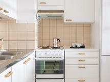 - Jääkaappipakastin, lattialiesi, sähköliesi, liesituuletin, kaapistot, kiinteät valaisimet. Keittiö on alkuperäinen, mutta siisti.