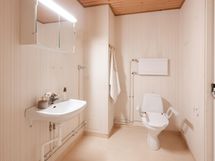 - Sauna, sähkökiuas, kylpyhuone, suihku, peilikaappi, pesukoneliitäntä, kiinteät valaisimet. Sauna ja kylpyhuone ovat alkuperäiset, mutta siistit.