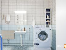 - Kylpyhuone, suihku, peilikaappi, pesukoneliitäntä, kiinteät valaisimet.