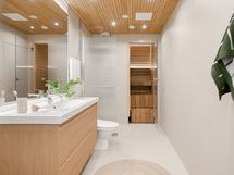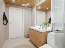 - Pesutilojen varusteet: WC-istuin, suihku, suihkuseinä, lattialämmitys, bidee-suihku, pesuallas, peili, pesukoneliitäntä ja allaskaappi. Pesutilojen kuvaus: Kylpyhuone pinnoitettu hartsipinnoitteella.