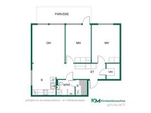 - Kylpyhuone: suihku, wc-istuin, peilikaappi, allaskaapisto, pesukoneliitäntä. Sauna: sähkökiuas.