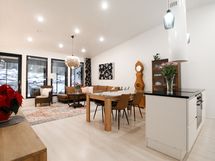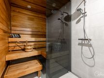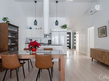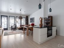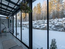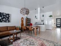 Saareke ja ruokailutila yhdistävät keittiön ja olohuoneen yhdeksi suureksi tilaksi. Korkea huonekorkeus luo upeaa tunnelmaa ja kaiken kruunaa olohuoneen ikkunoista näkyvä metsä ja kallio. Suojaisa piha-alue tarjoaa mahdollisuuksia vaikka mihin! Tontti rajautuu metsään, joten voit ottaa aurinkoa ja nauttia kesäpäivästä kaikessa rauhassa, suojassa ohikulkijoiden katseilta.