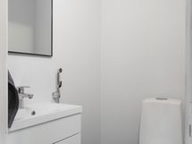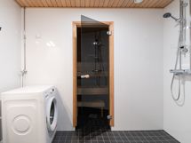- Kylpyhuone, suihku, peilikaappi, allaskaappi, pesukoneliitäntä, lattialämmitys, kiinteät valaisimet, käsisuihku, roiskesuojattu ovi, wc istuin, sähkösauna, erillinen wc: peili, allaskaappi, käsisuihku. Lattia: Laatta. Seinät: Kylpyhuone laatta, saunassa paneeli, erillinen wc maalattu