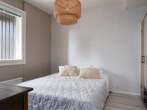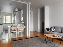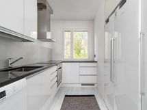 - Jääkaappi, pakastin, kaapistot, astianpesukone, induktioliesi, erillinen uuni, kiinteät valaisimet (led-valot), liesituuletin hormiin. Lattia: Laminaatti. Seinät: Maalattu, välitila levy