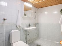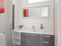 - Sauna, sähkökiuas, kylpyhuone, erillinen wc, suihku, peilit, peilikaappi, kaapit, allaskaappi, kiinteät valaisimet.