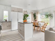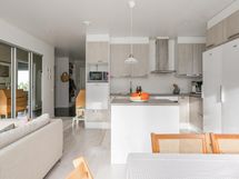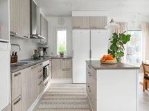 - Jääkaappi, pakastekaappi, erillisuuni, induktioliesi liesituulettimella, astianpesukone (korotettu), kaapistot. Keittiösaareke