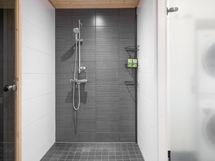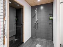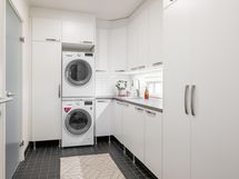 - Sauna, sähkökiuas, kylpyhuone, erillinen wc, suihku, peilikaappi (erillisessä wc:ssä), pesukoneliitäntä (kodinhoitohuoneessa), lattialämmitys. Kodinhoitohuone (pesuallas, runsaasti säilytystilaa, tila pesutornille). Kylpyhuoneessa kiinteä vaatekuivausteline.