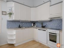 - Jääkaappi, pakastekaappi, liesitaso, keraaminen liesi, liesituuletin, astianpesukone, kaapistot, kiinteät valaisimet.