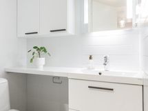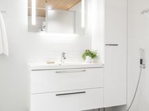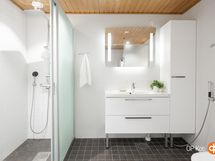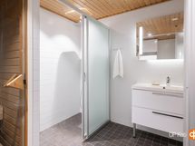 - Sauna, sähkökiuas, kylpyhuone, erillinen wc, suihku, suihkuseinä, peilit, kaapit, pesukoneliitäntä, lattialämmitys, kiinteät valaisimet.