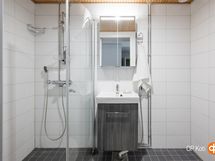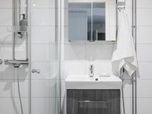 - Kylpyhuone, suihku, 2 kääntyvää suihkuseinää, peilikaappi, allaskaappi, pesukoneliitäntä, kiinteät valaisimet. Erillinen wc, jossa myös peilikaappi ja allaskaappi.