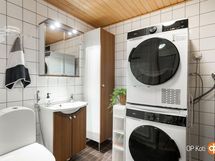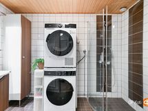 - Sauna, sähkökiuas, kylpyhuone, suihku, suihkuseinä, peilikaappi, allaskaappi, pesukoneliitäntä, lattialämmitys, kiinteät valaisimet. Kylpyhuoneessa ja saunassa lattialämmitys.